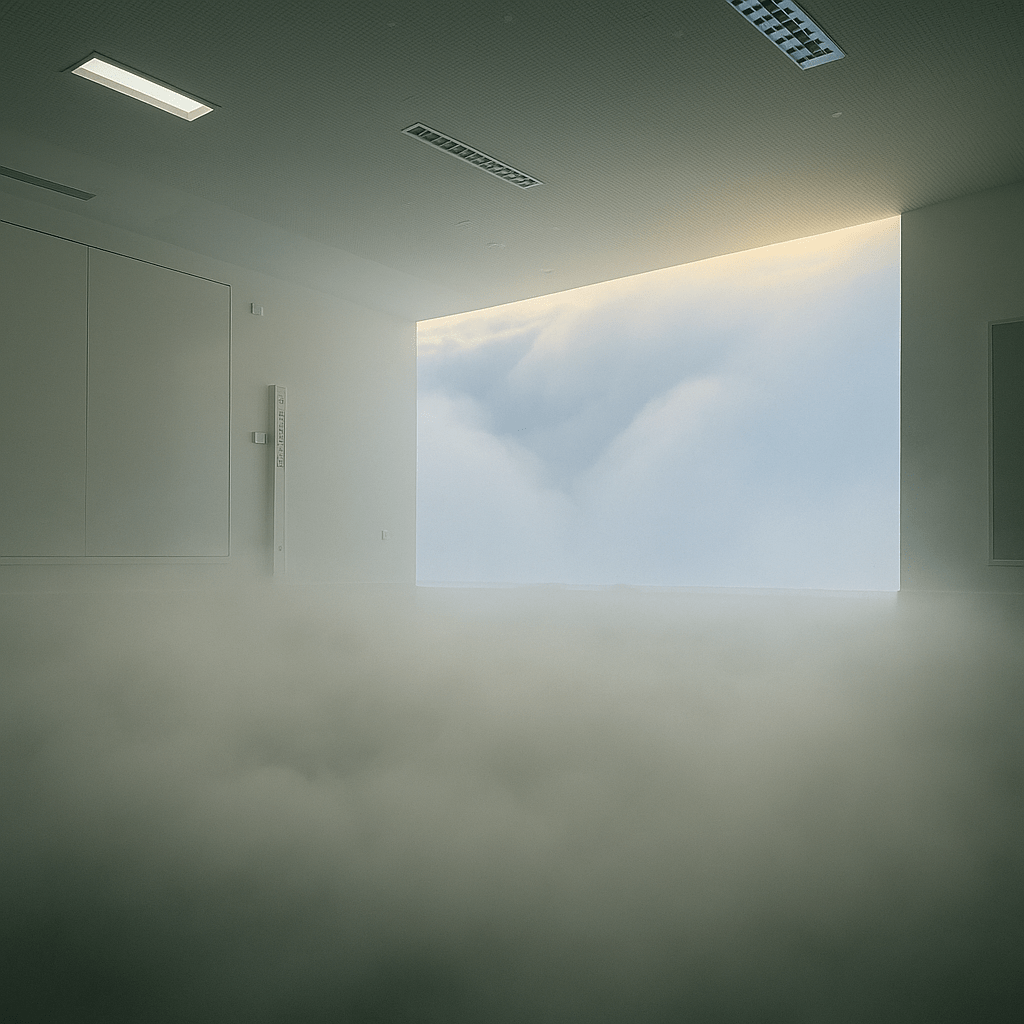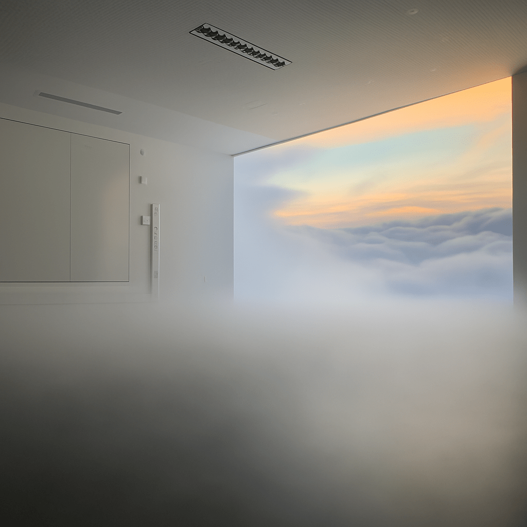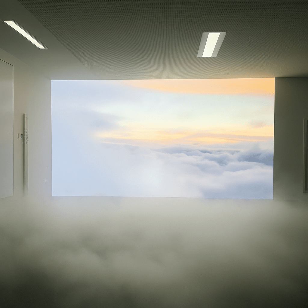 Skyline 2 is an immersive installation that draws the viewer into an atmospheric space, suspended between image and matter. A sea of clouds is projected onto the wall and physically extended into the environment by an artificial fog that rises from the floor to mid-height, dissolving outlines and erasing spatial markers. The image seems to drift beyond the screen, becoming climate—altering the perception of space and of the body itself.
