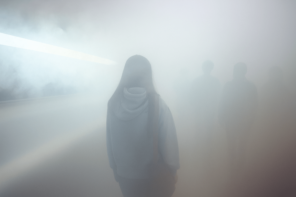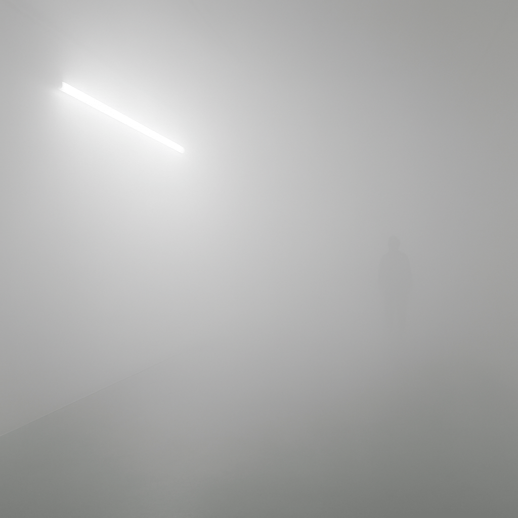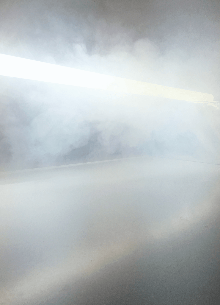 This work questions how sensory alteration and disorientation alter our perception of the environment and, by extension, our relationship to the artwork, by offering us a two-part experience. At the entrance to the room, a cold white light, emitted by neon lights, and a soundscape define the atmosphere. Gradually, an artificial fog invades the space, synchronized with the fading of the sound. As the smoke unfolds, the sound slowly disappears, plunging the viewer into a back-and-forth between transparency and opacity, silence and noise, dreamscape and reality.