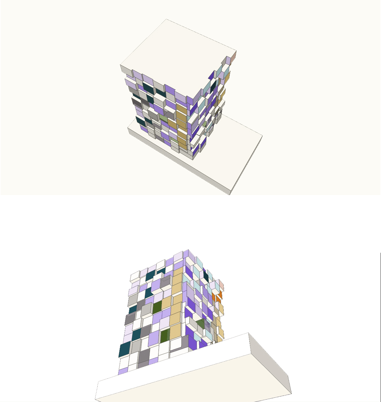 Starting from the idea of an abandoned building in an urban area, I create a model that represents the tower in full transformation of its facades by the emersion of colored cubes in volume.