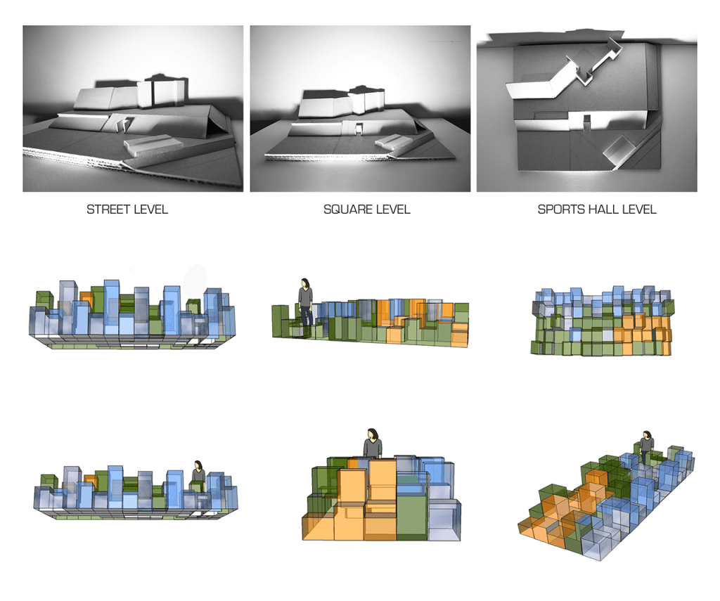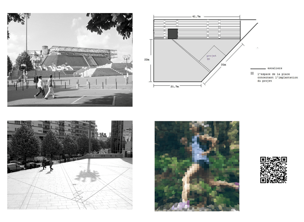 Using the specificity of the place that gives 3 different hypsometric levels the structure changes, giving the possibility to the spectator to exchange in different ways: Distant observe (street level) / active participant (square level) / part of an interaction (flash code to the entrance level).